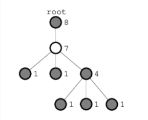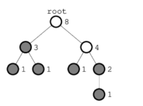 The tree above has five balanced nodes marked in gray. The root is not balanced because its subtrees are of different sizes: the left subtree’s size equals 3 and the right subtree’s size equals 2.