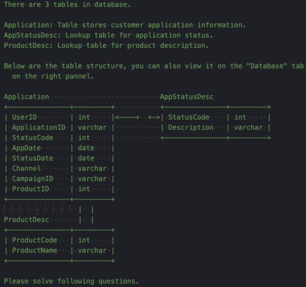 没有任何提示,我先快速扫了一眼,确认这是一个典型的信用卡申请数据:Application 是主表,另外两张是状态和产品的 lookup 表。